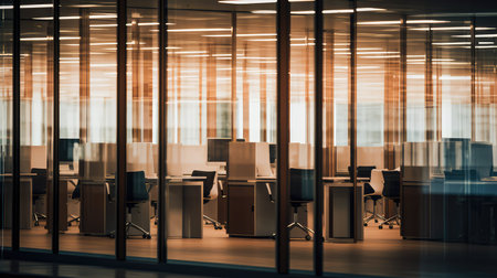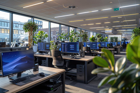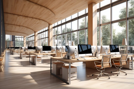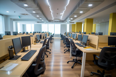 Modern office with sleek design and computer workstations in open layout. That the image is generated using AI.
