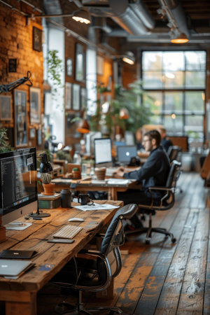 A modern office space with several people working on computers