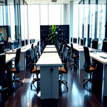 Modern office interior with collaborative workspace and ample natural light during daytime hours