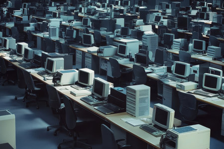 Numerous vintage computers are organized in rows within a large, dimly lit office. The atmosphere is nostalgic, highlighting the technology of an earlier era.