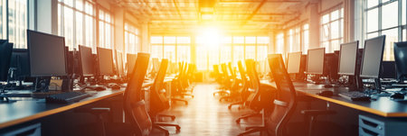Empty Open Plan Office Space Bathed in Warm Golden Sunlight. Modern Workplace Interior Design.