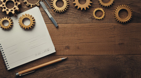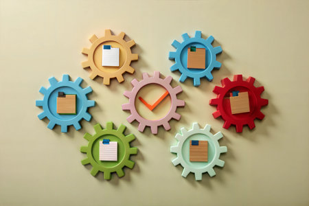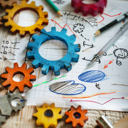 Colorful gears symbolize teamwork and innovation in a business workspace. The image features gears on documents conveying strategy and collaborative processes.
