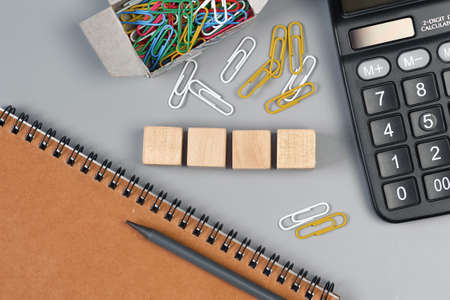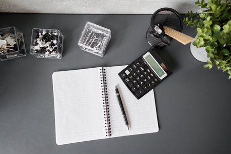 Office desk table with supplies, paper, calculator. Top view with copy space. Selective focus. Business Financing Accounting Banking Concept. High quality