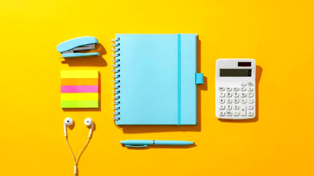 A collection of office supplies including a notebook, calculator, earphones, pen, sticky notes, and a stapler arranged on a vibrant yellow background.