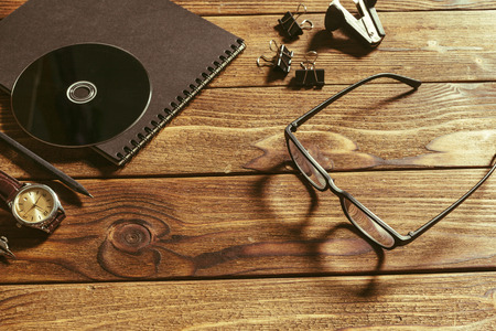Notebook, laptop, glasses and pen on the table. Concept of business or study.