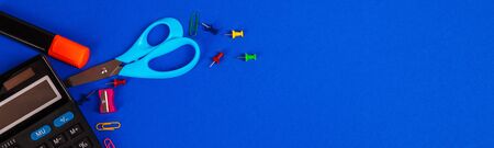 Banner of School or office stationery on blue background. Back to School. Frame, copy space. Top view. School supplies
