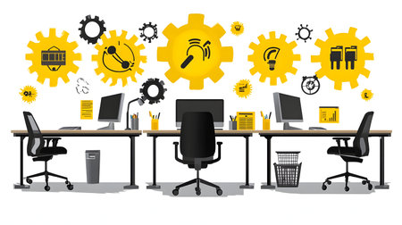 Teamwork, collaboration, and productivity are illustrated in this image featuring a modern office space with computers, desks, and symbolic gears.