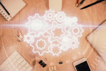 Working gears connect into puzzle, top view. Teamwork and collaboration concept