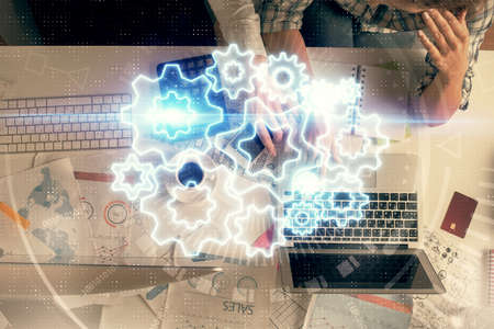 Double exposure of man and woman working together and business theme hologram drawing. Computer background. Top View.