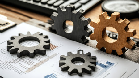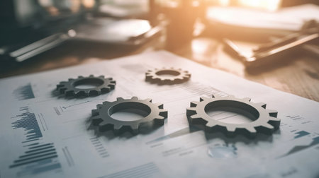 A close-up capture of metallic gears resting on business documents featuring charts and graphs, symbolizing the intersection of engineering and business strategy.