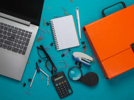 Office tools. Laptop, calculator and stationery on blue background. Office chaos. Top view