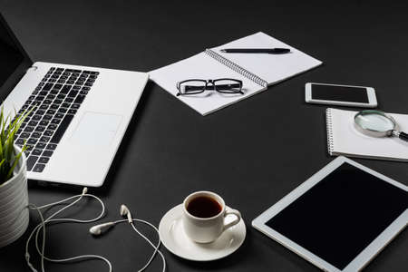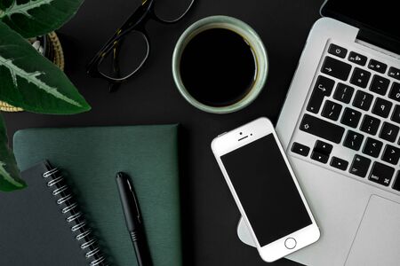 Top view of office workplace with digital gadgets. Flat lay black surface with laptop, green plant and cup of coffee. Top view coworking workspace with copy space. Digital technology and mobility.