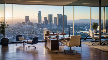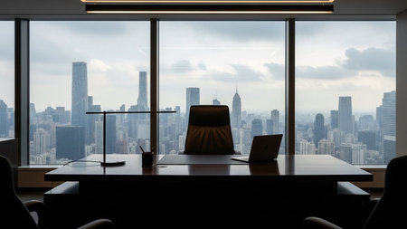 Luxury office interior with panoramic window and city view
