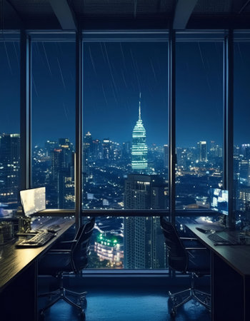 Modern office interior with a panoramic view of the city at night