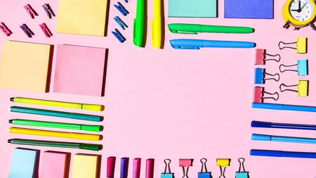 The concept of Back to school. School stationery on a pink background, background