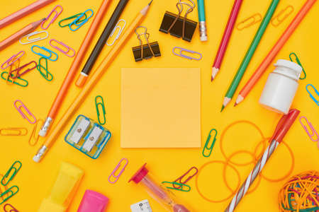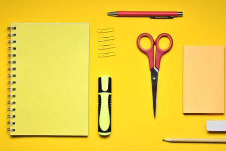 School stationery on a yellow background. Top view with copy space. Flat lay. Back to school concept.