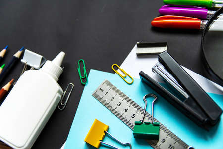 Various stationery items lie on a black background. School, office concept.