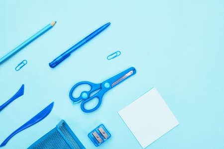 Layout of stationery on a blue pastel background. Monochrome school concept.