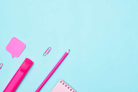 minimalism pink stationery on blue background school, university, flat layer, copyspace