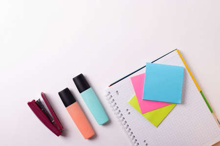 notebooks and pens with colored felt-tip pens and a stapler for studying at school on a white desk