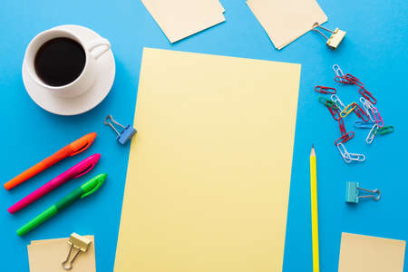 top view of cup of coffee and empty papers near colorful pens and paper clips on blue