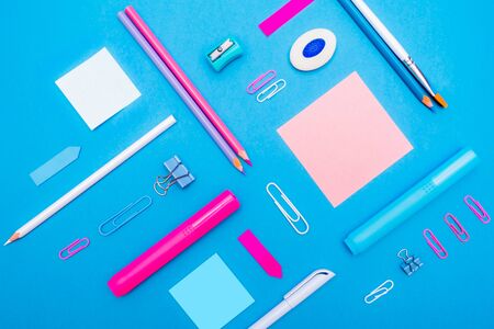 Flat lay composition with stationery or school supplies in pink purple shades scattered in a circle on a blue background with copy space. Teachers day concept
