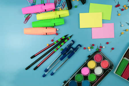 Back to school concept. Top view photo of stationery notepads blue adhesive tape binder clips colorful pens stapler paper sticky notes and round correction tape on isolated blue background