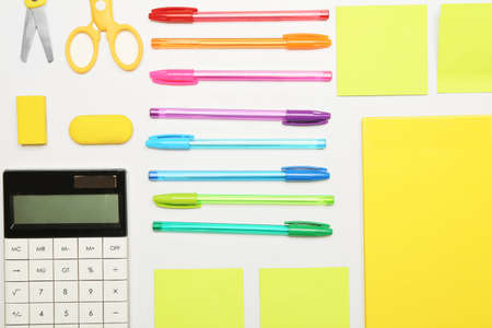 Composition of colorful school equipment with notebook and calculator on white surface. School equipment, tools, learning and creativity concept.
