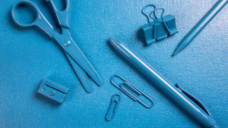 Various blue stationery on a blue background. Office, school and handicraft concept.