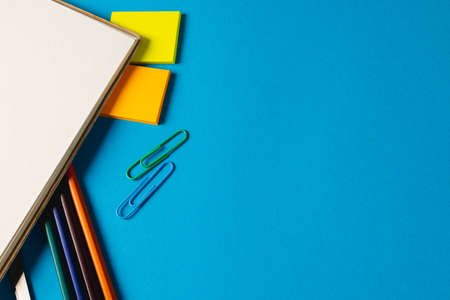 School stationery on a blue background. Back to school concept. Top view, copy space. Open paper notebook, red pen, eraser, green pencil sharpener and colorful paper clips.