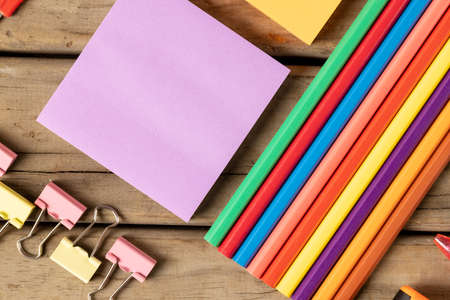 Composition of crayons, post it and clips on wooden surface. School equipment, tools, learning and education concept.