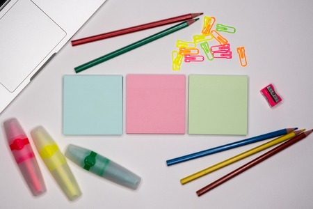 Colorful sticky notes and stationery on office desktop. Text space