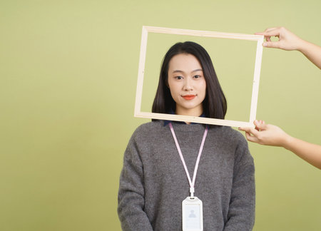 A woman stands confidently against a soft green background, wearing a cozy sweater and badge. Another hand holds a wooden frame around her face, capturing a unique artistic moment.