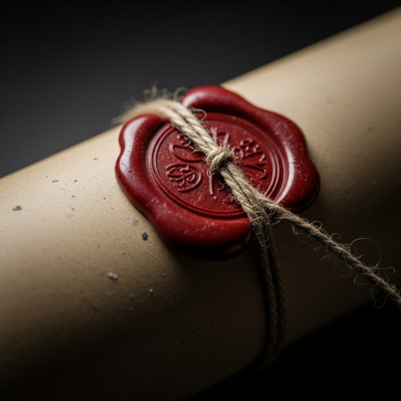 A close-up of a vibrant red wax seal pressed onto an aged parchment document, securing its contents with a traditional stamp.