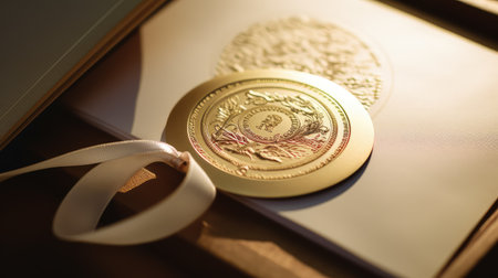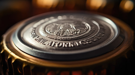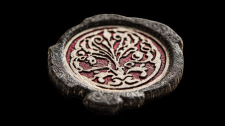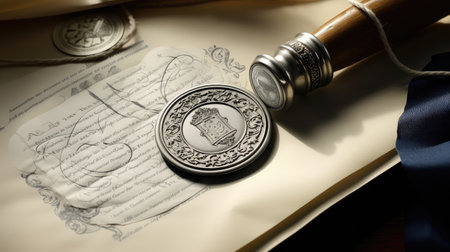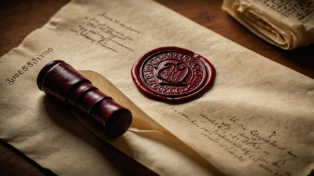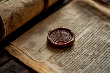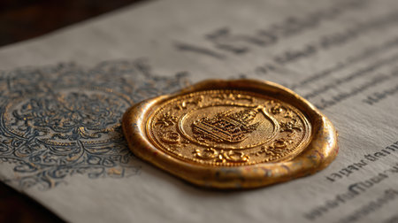 A stunning close-up of a golden wax seal resting on an ornate scroll, showcasing intricate details and historical significance, perfect for art and history themes.