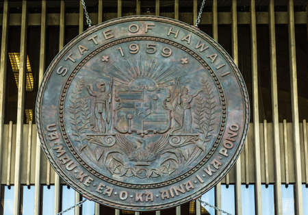 Honolulu Oahu, Hawaii, USA. - January 10, 2012: Closeup of bronze seal of State of Hawaii in front of the capitol.