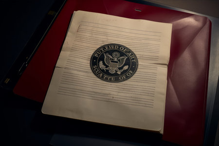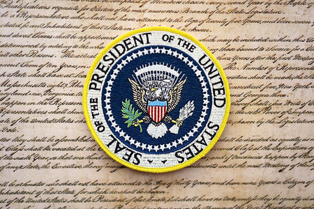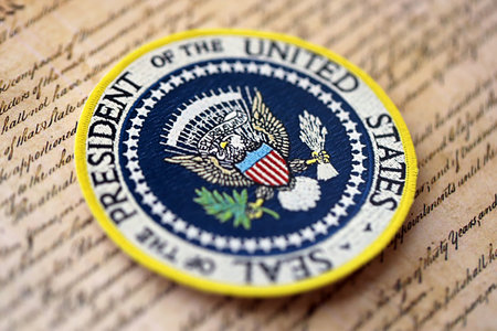 KYIV, UKRAINE - DECEMBER 13, 2025 Seal of the President of the United States sticker on United States Constitution replica first main page close up. We the People