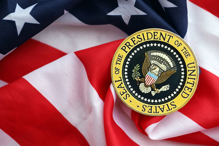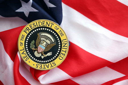 KYIV, UKRAINE - DECEMBER 13, 2025 Seal of the President of the United States sticker on United States of America folded waving flag with stars and stripes close up