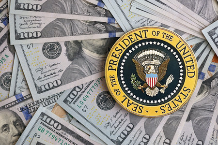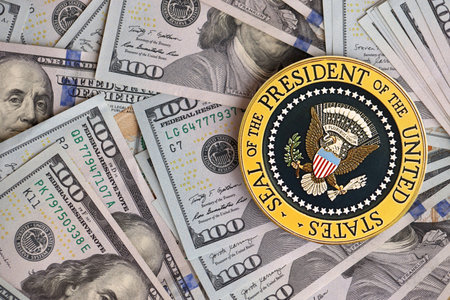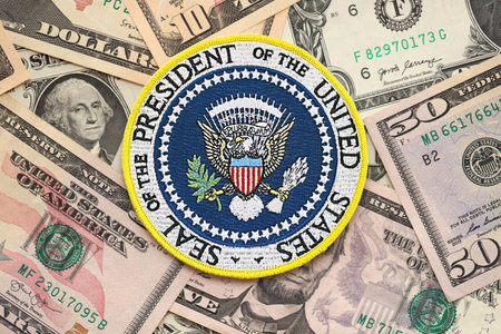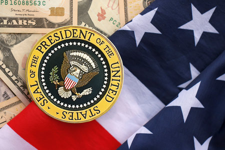 KYIV, UKRAINE - DECEMBER 13, 2025 Seal of the President of the United States sticker on big amount of US dollar money bills banknotes and United States flag close up