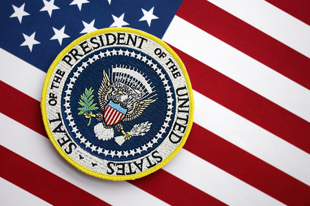 KYIV, UKRAINE - DECEMBER 13, 2025 Seal of the President of the United States sticker on United States of America flag with stars and stripes close up