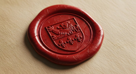 A close-up macro shot of a traditional red wax seal pressed onto a parchment-like envelope. The seal features an ornate heraldic crest with a lion and fleurs-de-lis, symbolizing authenticity, official correspondence, and tradition.