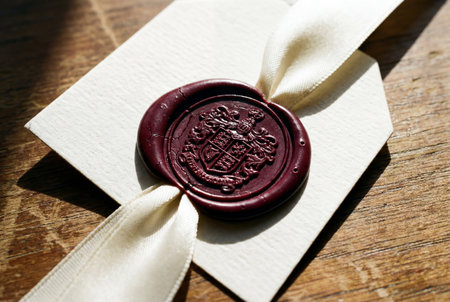 A deep red wax seal, embossed with an intricate crest, secures a cream-colored satin ribbon around an off-white textured envelope.