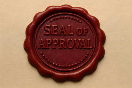 Red wax seal with the words sale of approved on it, on a brown background