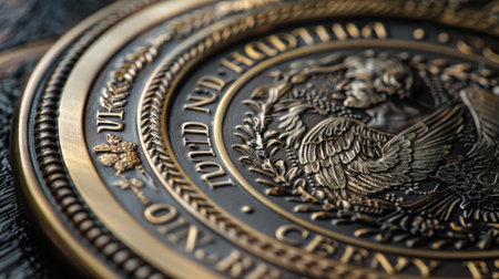 A gold and silver eagle emblem with the words United States of America on it. The design is ornate and intricate, with a sense of grandeur and importance