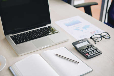 Image of workplace of businessman with a laptop. On the table are paperwork, laptop, tablet, and paperclip