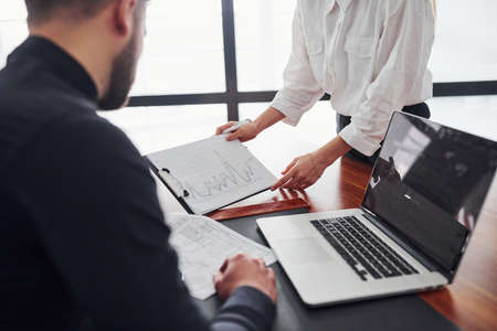 Woman and man in formal clothes working together indoors in the office by table with documents.
