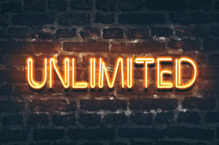Unlimited neon sign on dark brick wall background