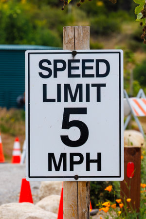 White sign with black letters indicating 5 mile per hour speed limit