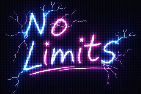 A vibrant neon sign displaying the words 'No Limits' in blue and pink against a dark background with crackling electric effects.
