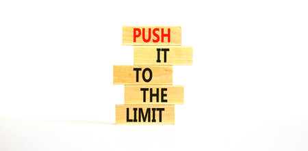 Push it to the limit symbol. Concept words Push it to the limit on wooden blocks. Beautiful white table white background. Business push it to the limit concept. Copy space.